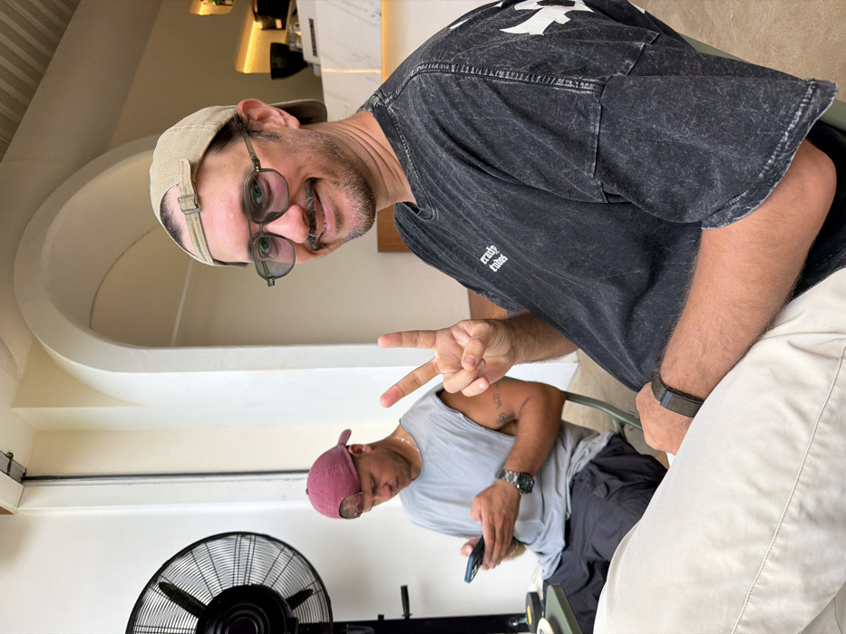 Two men sit in an indoor setting. One man, wearing a khaki cap and glasses, leans into the frame, holding up two fingers in a peace sign. He wears a black t-shirt and light pants. Behind him, another man in a maroon cap and grey tank top looks at his phone. A fan stands in the lower left corner, and a white wall with an arched design appears in the background.