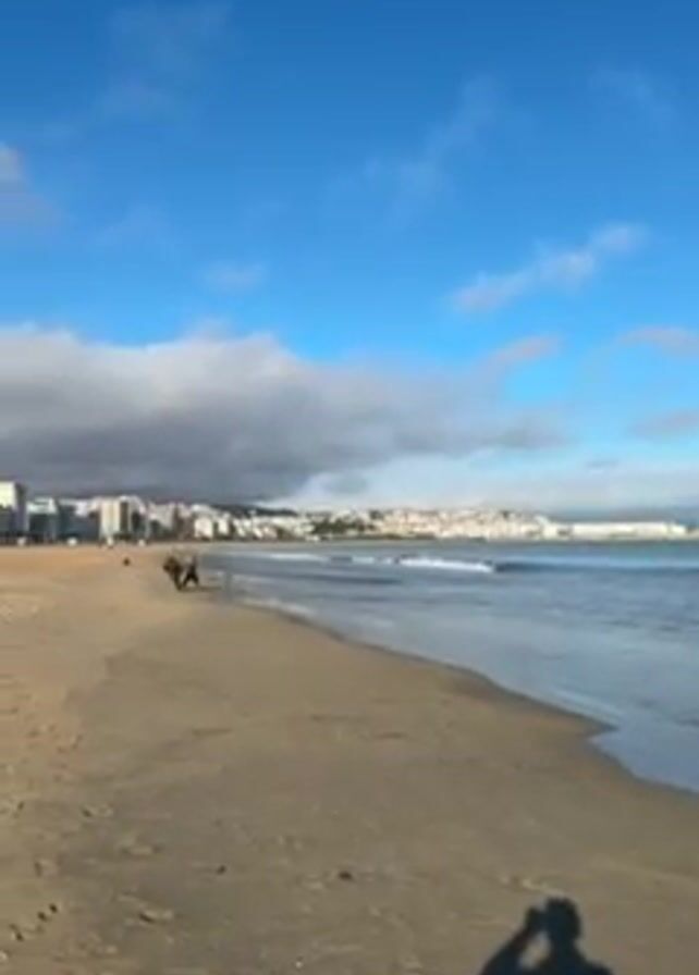 beach scene on a partially cloudy day. The sky is blue with patches of clouds, some appearing darker and heavier towards the horizon. The beach has tan sand and is gently sloping towards the ocean. There are small waves coming in. In the background, a city with white buildings is visible along the coastline. Two people are walking along the shoreline. The shadow of a person holding a camera is visible in the foreground. The camera seems to be moving, either panning or walking forward.