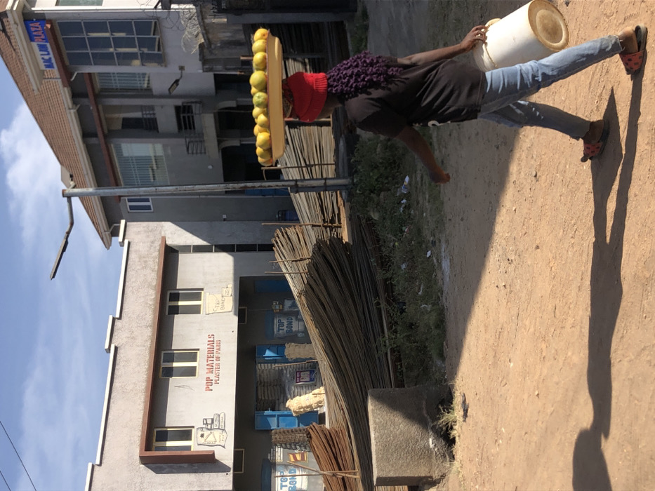 The image displays an outdoor urban scene on Rukuba Road, Nigeria, under clear blue sky and bright sunlight, casting long shadows across the ground