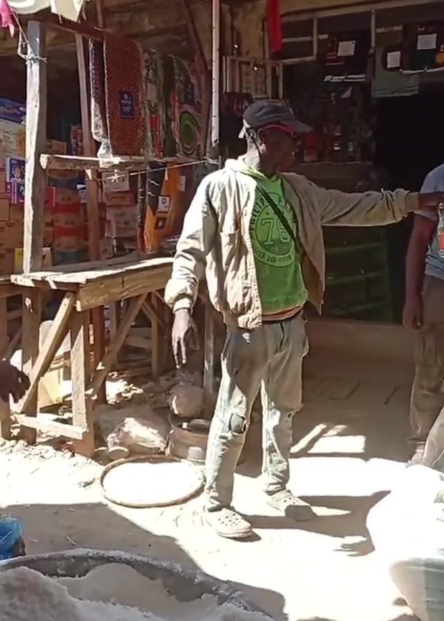 The video depicts an outdoor market or storefront. A man wearing a green shirt, khaki jacket, ripped jeans, a baseball cap, and sunglasses stands in the center, holding a small water bottle in his right hand and gesturing with his left. He is speaking and appears to be the center of attention. To his left, another man in a white and green shirt walks past. Behind the speaking man, various items are displayed on shelves and tables, including boxes of food, fabrics, and other goods. In the foreground, there's a large container filled with what appears to be a white powder, possibly flour or rice. A woman wearing a purple shirt and red head covering walks in front of the man in green, apparently speaking to him. The setting seems to be a bustling commercial area, with people moving about and goods being sold.