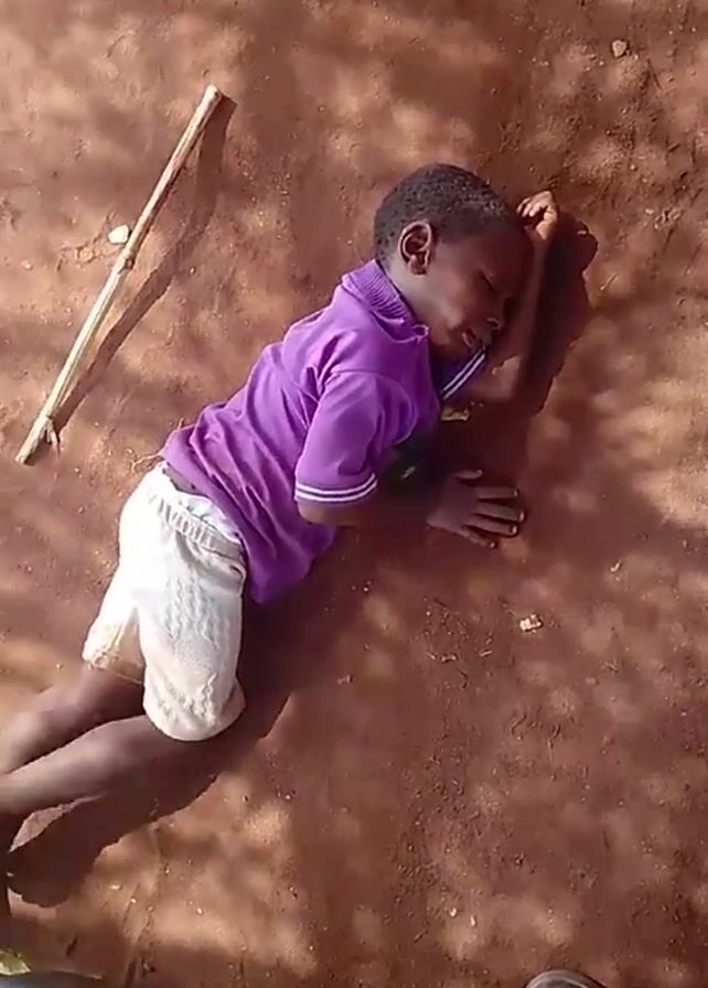A young boy lies on a reddish-brown dirt ground, crying. He is wearing a purple polo shirt with white accents and white shorts. A thin stick lies near his head. Two pairs of feet, one shod in black shoes and one barefoot, are visible at the bottom of the frame. The setting appears to be outdoors. The boy is the central focus of the scene.