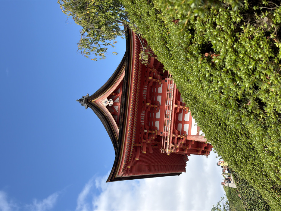 - "A multi-tiered Japanese temple building, identified as part of the Kiyomizu-dera Temple complex in Kyoto, Japan, is depicted from a low angle under a clear blue sky with scattered white clouds" by FM-z9y802, licensed under CC BY 4.0