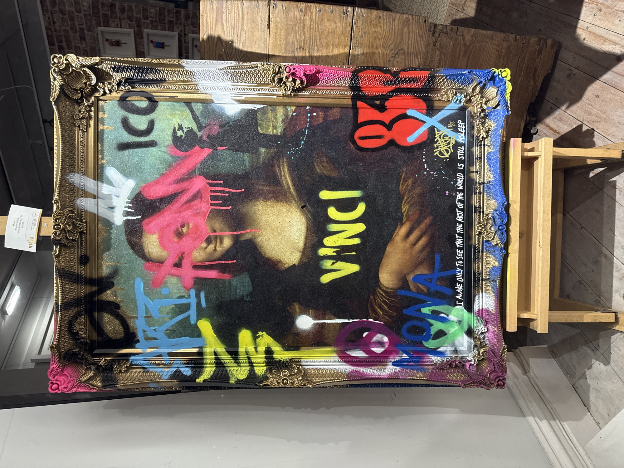 The image presents a vandalized print of the Mona Lisa displayed on an easel
