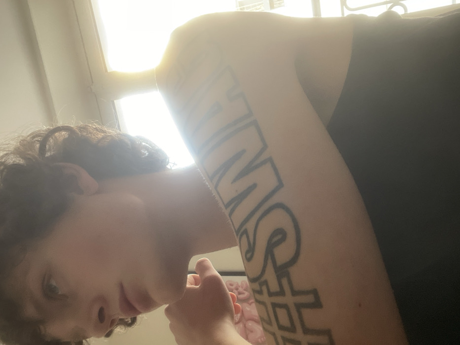 A person with curly hair and a tattoo is shown in a close-up, angled shot. The tattoo on the person's arm features large, outlined letters. A bright window is visible in the background, casting a strong light. The person's face is partially obscured by shadows, but the nose and lips are still visible. The person is wearing a dark-colored top or garment.