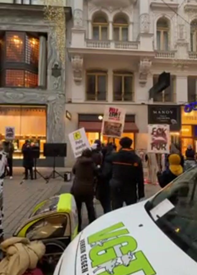 The video depicts an anti-fur protest taking place on a European city street. A group of people hold signs with slogans like "Pelz macht hässlich" (Fur makes you ugly), "Pelz leidet" (Fur suffers), and "Fck Fur." A white car with the logo "VGT, Verein gegen Tierfabriken" (Association against Factory Farming) is prominently featured in the foreground. The protest is occurring in front of high-end stores, with a building decorated with Christmas lights visible in the background. A sound system is set up, suggesting organized activity. Passersby are visible on the street.