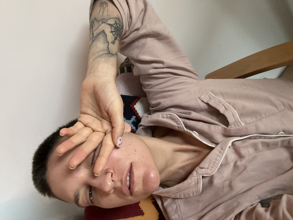 The image depicts an individual indoors, positioned in a close-up, slightly overhead self-portrait