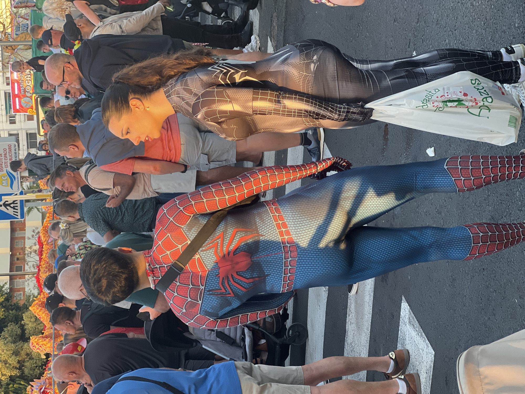 crowd of people in Playa Del Inglés, Spain. The location appears to be a street during a public event, possibly a parade or festival, as suggested by the presence of a Chinese-style dragon decoration visible in the background. Many people are standing, looking towards a certain direction where the event is happening. Two individuals are dressed in Spiderman costumes, one in the classic blue and red design, and the other in the symbiote black suit. The person in the black suit carries a plastic shopping bag from a store with the brand name "osito" visible. They are positioned on a pedestrian crossing. The overall atmosphere suggests a festive public gathering.