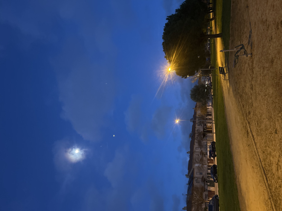 A slightly tilted outdoor scene shows a park at night. The sky is blue, with clouds and the moon visible. Buildings line the edge of the park, illuminated by streetlights. The park includes a dirt path, grass, trees, a bench, and exercise equipment. The overall impression is a peaceful urban park at dusk or night.