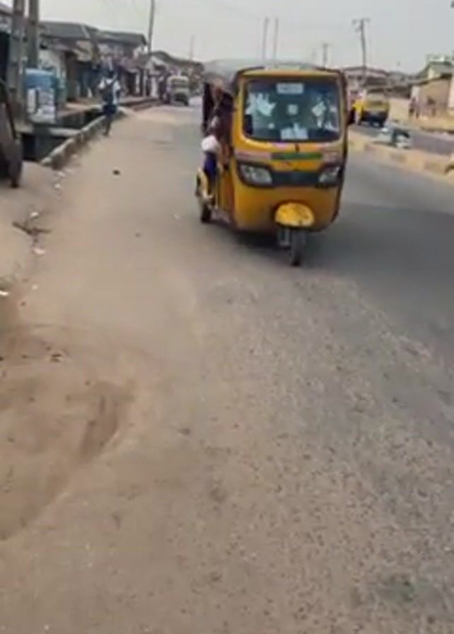 street in an urban area. The road is paved with asphalt and has white lines dividing the lanes. A yellow auto rickshaw, commonly known as a "keke," passes by. A person is riding in the back of the keke. In the background, cars and other kekes are seen. The sidewalks are concrete and appear worn. There are buildings, shops, and power lines on either side of the road. A person walks on the left sidewalk. The sky is overcast.