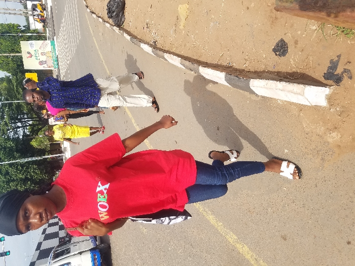 The image depicts a daytime street scene in Awka, Nigeria, likely near a busy intersection. In the foreground, a young adult female walks leftward across the frame on an asphalt road. She wears a black headscarf, a red t-shirt with "WOEX" emblazoned in colorful letters, blue denim jeans, and white slide sandals. A black and white bag is slung over her left shoulder, with her right hand gripping the strap. Long shadows indicate bright sunlight. In the mid-ground, behind the primary subject, several individuals are also walking. A woman in a bright yellow dress and red shoes walks away from the camera. Beside her, a man in a blue patterned long-sleeved shirt, light-colored trousers, and dark sandals walks towards the camera, holding a dark object to his right ear. The environment features a road with a faded yellow line and a painted concrete curb (white and black sections) separating it from a dirt shoulder. Scattered black plastic debris is visible on the shoulder. In the background, a large billboard with "APGA" (All Progressives Grand Alliance) and a rooster logo is prominent. A white van with a checkered pattern on its side and a "keke napep" (tricycle taxi) are partially visible. Traffic lights with green signals are visible in the upper left, and trees line the distant background.