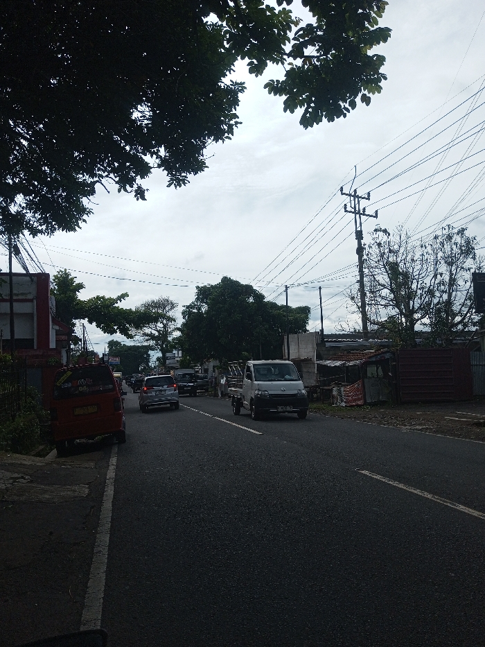 A gray street leads to cars, including a red minivan parked, a gray car, and a white utility vehicle. Power lines stretch across the sky with trees and buildings visible. Foliage frames the top of the image. A narrow sidewalk runs along the left side of the road. There are buildings on both sides of the street, and a few trees on the street.