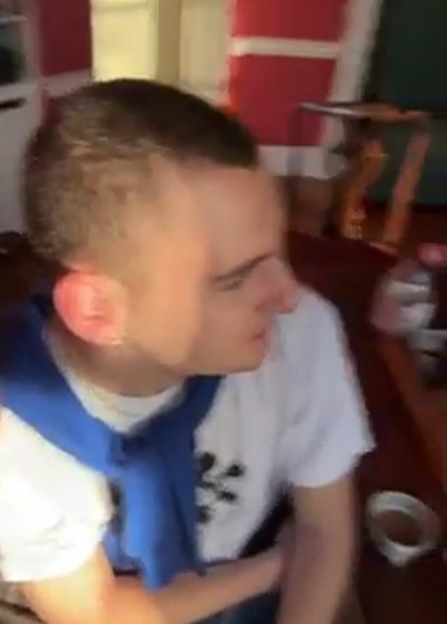 Two men are in a room with red walls. One man wears a dark gray sweater and has a mustache. The other man wears a white t-shirt with a design on it and a blue sweater tied around his shoulders. They both have earrings. There is a bookcase filled with books in the background. There is a table with a cup, a newspaper, and bottles of water on it. The men are talking, and the man in the gray sweater smiles at the camera.