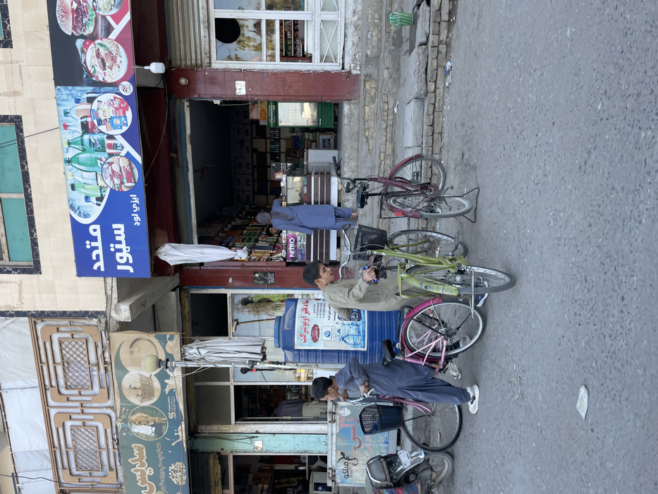The scene depicts a street-level view of a commercial area in the city of Unknown, Unknown, featuring multiple storefronts alongside a paved road. In the foreground, two young males, dressed in light-colored traditional attire, stand near three bicycles. One boy in blue-grey is next to a pink bicycle with a front basket. Another boy in light brown stands beside a green bicycle, also equipped with a front basket. A maroon bicycle with a rear rack is propped on a stand to their right. Partial view of a dark motorcycle/moped is on the far left. The midground features two adjacent storefronts. The right store, labeled "متحد ستور" (Mutahid Store) with additional text "ايزي لود" (Easy Load), displays a large blue sign advertising sodas, snacks, and prepared foods like burgers and pizza. The store interior is visible, showing stocked shelves, a counter, and a green display refrigerator. A person in blue-grey clothing stands at the counter, seen from behind, while another individual is partially visible behind the counter. The left storefront, partially obscured, has signage featuring an animal head and a basket of eggs. A large blue plastic water tank with a sticker is positioned near its entrance. A streetlight pole, wrapped in white material, stands between the two shops. The background consists of the upper floors of the buildings, featuring light-colored facades with decorative window grates. The street pavement in the foreground shows minor debris, including a small piece of paper. A green watering can is visible on the sidewalk near the right store.