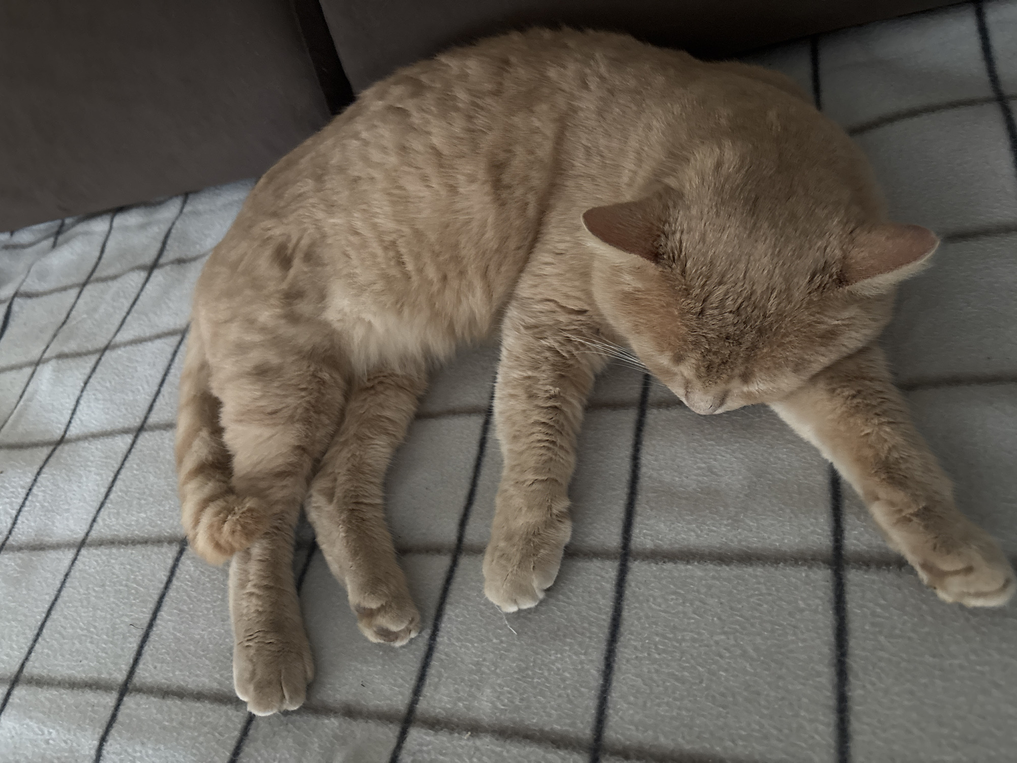 - "A light orange cat is lying on a gray and white plaid blanket, with its head tucked down and front paws extended" by FM-PD7Ls2, licensed under CC BY 4.0
