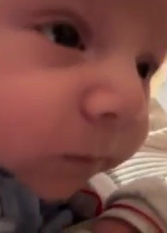 A close-up shot shows a baby lying down, held by a woman. The baby is wearing a light blue collared shirt and is drooling. The woman is wearing a cream-colored top. In the background, there is luggage and a floral pattern. The baby makes noises that sound like gurgling.