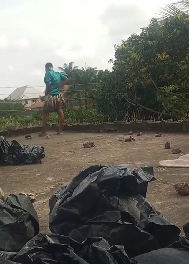 person on a rooftop littered with black plastic bags, debris, and small stones