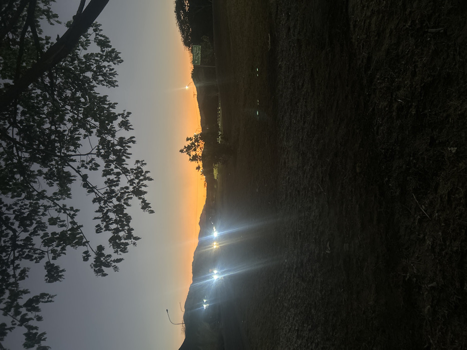 The image captures an outdoor scene at dusk in San Diego, Venezuela, evidenced by a partially visible road sign displaying "San Diego" and "Distribuidor". The horizon features a pronounced orange-yellow glow from the setting sun, transitioning upwards to a dark blue-grey sky. In the foreground, dark, uneven ground is covered with sparse, dry vegetation. Bright white headlights from multiple vehicles, at least three, are visible on a road in the midground, casting strong light streaks. A street lamp on the right also emits light. Distant, dark mountain ranges are silhouetted against the glowing sky. A large tree branch with leaves occupies the upper portion of the frame, partially obscuring the sky. No individuals are discernible.