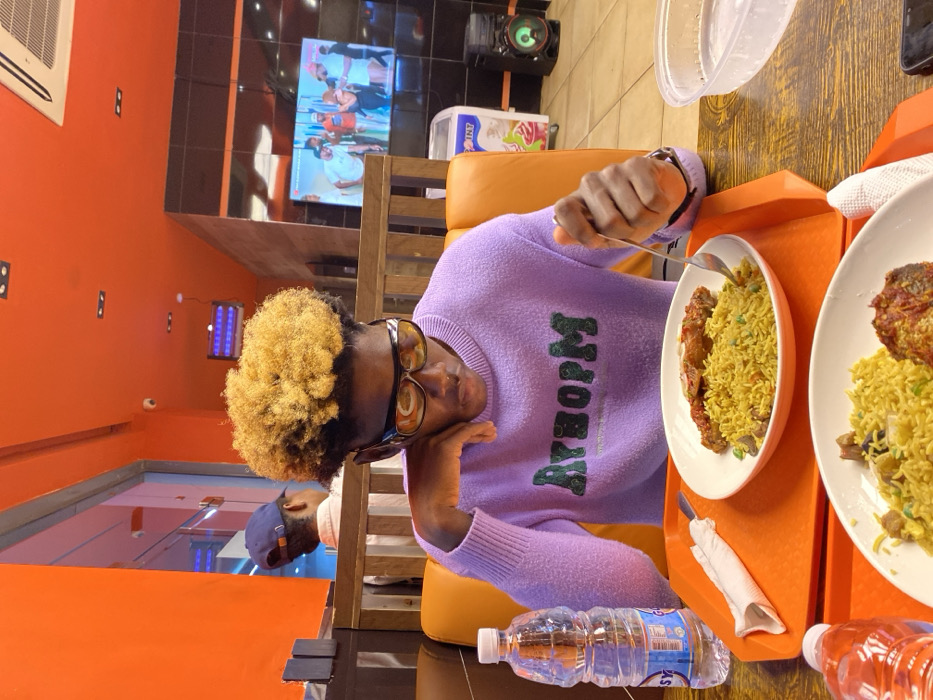 This image depicts an indoor scene within a casual restaurant or eatery in Moba, Nigeria. The dominant colors of the establishment's interior are orange for the walls and ceiling, complemented by dark tiled floors and booth seating with orange upholstery and dark wood dividers. In the foreground, a person with distinctive bright yellow, textured hair is seated at a table. They wear dark-rimmed glasses with yellow-tinted lenses and a light purple long-sleeved sweater featuring green text, possibly "ATHOPM," across the chest. Their right hand is resting on their chin, while their left hand holds a silver spoon poised over a white plate. This plate contains a portion of yellow rice, appearing to be jollof or fried rice with green peas, and several pieces of chicken or meat in a red sauce. The plate rests on an orange plastic serving tray. To the left of the plate, a clear plastic bottle of "OSY" branded water is visible. A second, similar plate of food is partially visible in the lower foreground on another orange tray. In the mid-ground, a second individual is partially visible from the back, seated at another booth. This person is wearing a light-colored top and a dark blue baseball cap, facing away from the camera. The background also reveals a large flat-screen television mounted on a dark wall, displaying an image with multiple people, likely from a video. Other elements include a wall-mounted blue-light insect zapper, an air conditioning unit on the ceiling, a black portable speaker on the floor, and a sign indicating "ICE CREAM TNY."