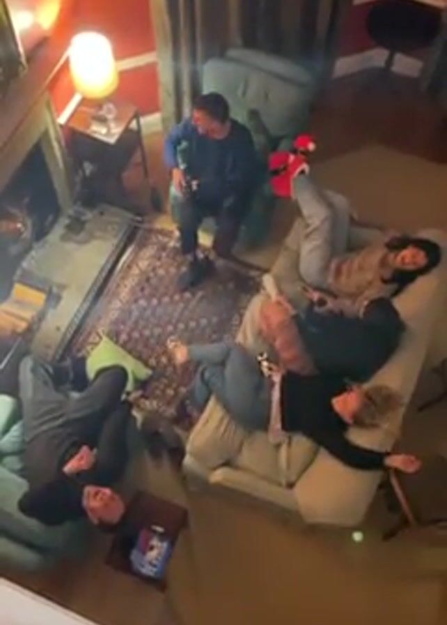 From a high vantage point, a living room is shown. A man sits in a chair, holding up one finger. On a large sofa, four people are laying down, with their feet elevated. A fireplace is to the left.