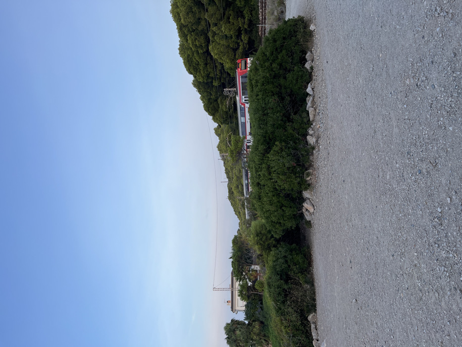 The image depicts an outdoor scene in Sant Pere de Ribes, Spain, characterized by a clear, pale blue sky at what appears to be late day. In the foreground, a light gray gravel path or unpaved road occupies the lower third of the frame. This path is bordered by a scattered line of light-colored rocks, behind which a dense, dark green bush occupies the lower mid-ground. Beyond the bush, a railway line is visible. A red and white commuter train is moving on these tracks, positioned from the right and partially obscured by the bush. The train's front section is predominantly red, transitioning to white with red detailing along its side. Overhead lines for the train are discernible above the tracks. To the left of the railway line and behind the bush, a light-colored building, possibly a house, is situated amongst trees. This building has a reddish-brown tiled roof and a tall, slender, metallic structure, resembling an antenna or utility pole, rising from its side. The background is dominated by a densely forested hillside, covered in dark green trees, which slopes upwards from the right towards the center-left. No individuals are present, nor are there any discernible actions or interactions occurring within the frame.