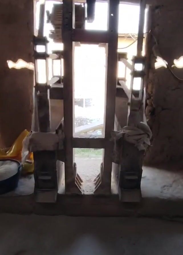 The camera, at floor level, shows a large wooden frame and machine in a semi-enclosed earthen-walled room, with the background light washing out visual detail. The machine appears to have an electric motor and belt drive at the top. The machine's frame is made of heavy timber and is set into a concrete floor. A yellow plastic bag and blue bucket with white contents sit to the left of the machine, on the floor. A bright opening in the back wall of the room, at the machine's center, provides a view of a landscape. The machine is in operation, with components reciprocating, producing a rhythmic noise. The walls of the room are rough and uneven, made of earthen materials. The environment suggests a workshop or small industrial space in a rural setting.