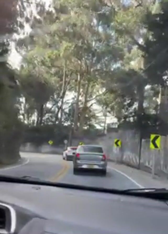 The video, shot from the driver's seat of a car, shows the vehicle traveling on a road that winds through a forested area that transitions into a more urban zone