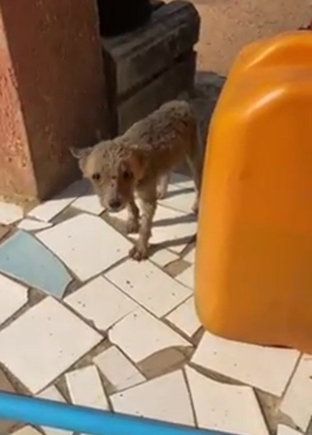 The video depicts a small, wet, and distressed animal that appears to be a fox pup standing on a tiled surface outdoors. The pup is greyish-brown with darker markings on its face and legs. Its fur looks matted, and it seems to be in poor condition. To the right of the fox pup, there's a large, orange plastic container. A red and white cap with a black chain attached is sitting on top of the orange container. In the background, there's a concrete or stone structure, and the ground is sandy or gravelly. The fox pup is looking at the camera and appears to growl. The lighting suggests it is daytime.