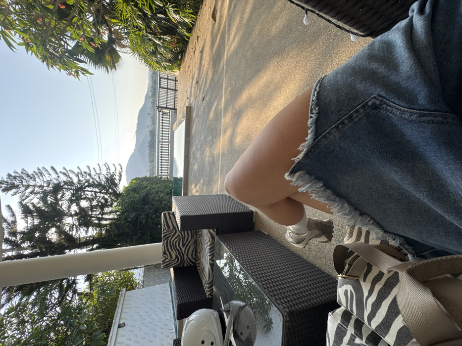 The scene is set outdoors at a elevated property in Baan Chaweng, Thailand, offering a panoramic view. The foreground features the legs of a person, extending from mid-thigh towards the right. The person wears light blue denim shorts with a frayed hem, a white sock, and a grey and white athletic shoe on the left foot. A black and white zebra-striped bag with a beige strap is partially visible on the bottom left. The ground is a light-colored, textured paved surface, illuminated by direct sunlight creating distinct shadows. In the midground, a seating area includes a dark brown/black wicker-style outdoor sofa and an armchair with zebra-stripe cushions. A matching wicker-style coffee table with a reflective glass top stands in front of the sofa. A white object, possibly a helmet, rests on the table. A prominent white vertical pillar supports an unseen overhead structure to the left. Beyond the seating area and the pillar, a rectangular infinity-edge swimming pool reflects the clear sky. A white textured wall is visible on the far left. The background reveals a vast landscape under a bright, clear sky. Tall, slender pine-like trees are on the left, with dense green foliage and bushes framing the view on both sides, including plants with reddish blossoms on the right. A distant body of water, likely the sea, is visible, bordered by a dark fence or railing at the property edge. Beyond the water, rolling green hills or mountains rise in the distance. Thin power lines traverse the sky above the distant landscape. No specific actions or interactions are depicted beyond the person's presence in the leisure setting.