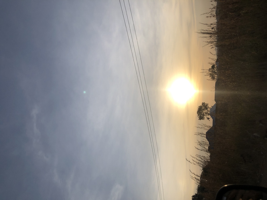 A daytime shot angled upwards captures the sun radiating intense light, with power lines cutting diagonally across the sky. Wispy clouds are visible on the left. On the right, a field of tall, dry grass meets the horizon. A lone tree and what appears to be a small structure are silhouetted against the bright sun. A corner of a car interior is visible in the lower right.