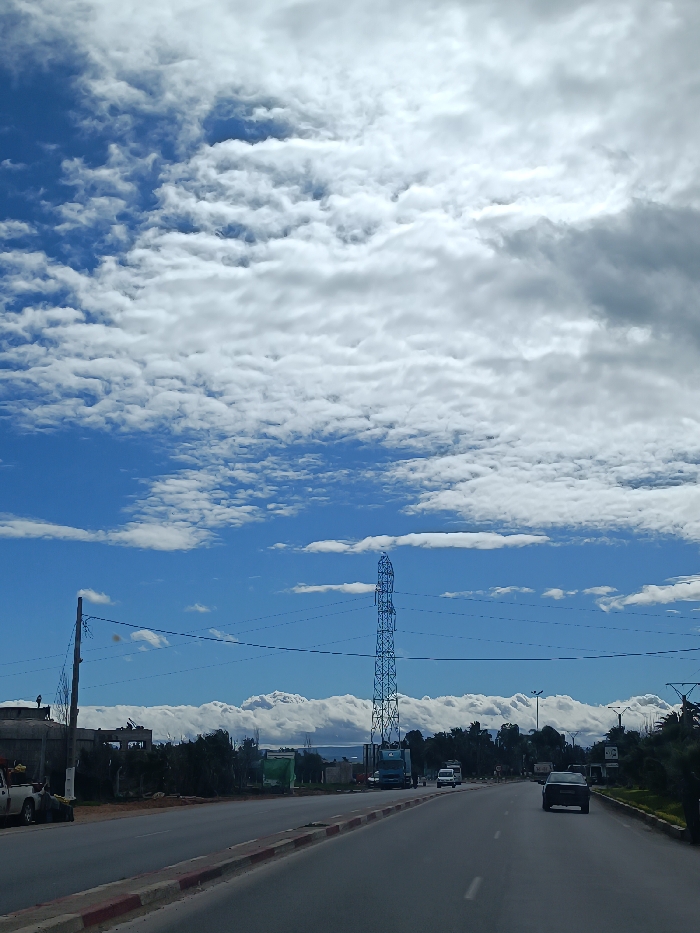 The image presents a daytime scene in Majjate, Morocco, viewed from a moving vehicle on an asphalt road. The sky occupies the upper two-thirds of the frame, displaying a mixture of blue patches with scattered white cumulus clouds and larger, denser white cloud formations, particularly in the upper right quadrant. In the foreground, the multi-lane asphalt road features red and white striped curbing on its left edge, separating it from an unpaved shoulder. Visible lane markings suggest the presence of multiple traffic lanes. On the immediate left shoulder, a white pickup truck is stationary. A wooden utility pole with multiple overhead wires stands behind the truck. Further left, partially obscured by the pole and wires, a concrete structure, possibly an unfinished building or industrial facility, is visible. In the mid-ground, a tall, slender blue-grey metal lattice tower, likely an electricity pylon, stands prominently on the left side beyond the immediate roadside. On the right side of the road, a treeline and several streetlights are visible. Vehicles are present on the road, including a dark sedan traveling in the right lane, moving away from the viewer. Further in the distance, a white van and another white car are discernible, also moving away. A blue semi-truck is positioned on the right side of the road, possibly parked or moving slowly. The background reveals a distinct horizon line of white clouds that appear to obscure or rest upon distant hills or mountains. No identifiable individuals are clearly discernible within the frame.