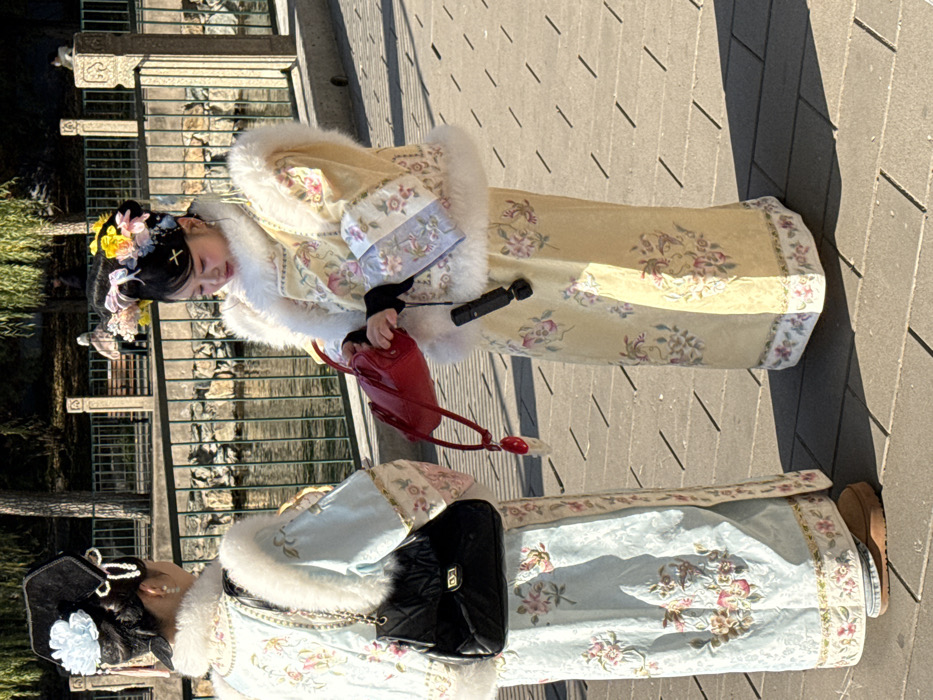 Two individuals, possibly females, are depicted in traditional Chinese garments with fur trim. The outfits are light blue and yellow, patterned with floral designs. One figure carries a red purse and holds a small electronic device. The other carries a black handbag. They are positioned on a tiled surface next to a body of water with a decorative stone structure in the background. The scene is illuminated by sunlight, creating shadows on the surface.