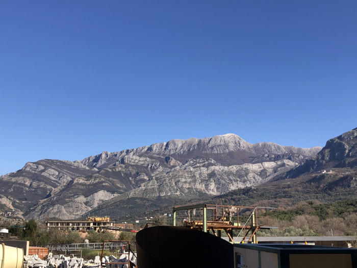 The image displays an industrial or construction area situated in Čeluga, Montenegro, framed by a prominent mountain range under a clear, cloudless blue sky
