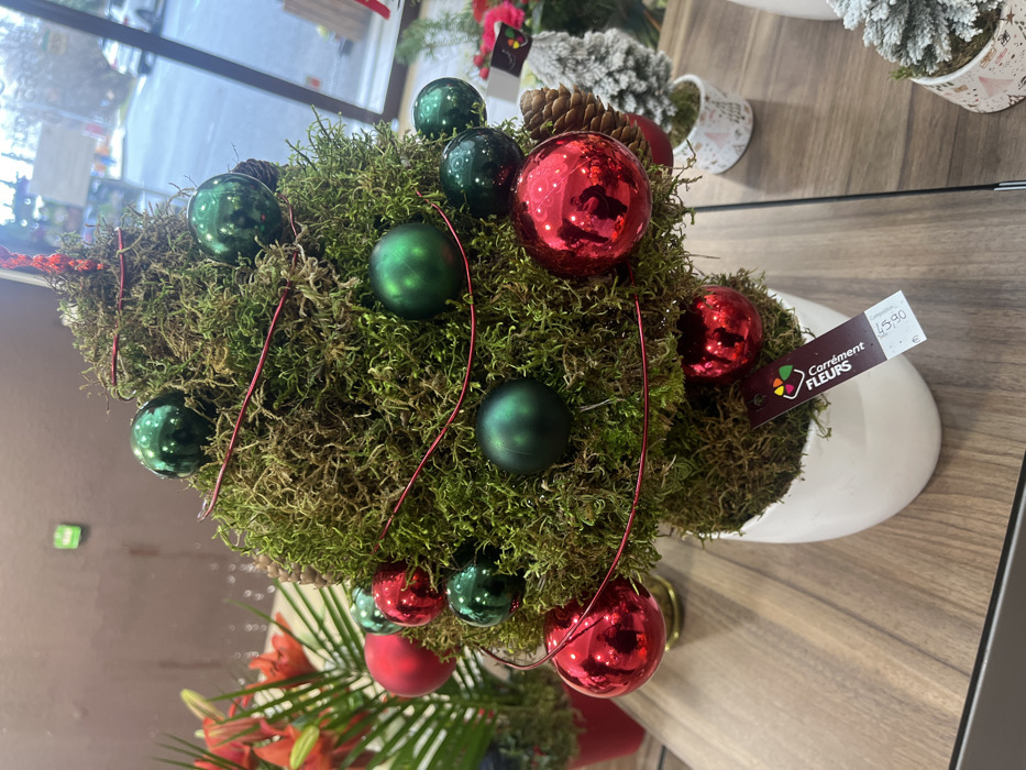 An indoor retail display in Aiguilhe, France, features a conical, moss-covered decorative piece resembling a small Christmas tree, positioned centrally on a light-colored wooden counter. The moss structure is adorned with multiple red and dark green spherical ornaments, some glossy and some matte, arranged unevenly. A thin, reddish-brown wire or garland spirals around the tree. A single natural pinecone is visible on the right side. The tree is planted in a smooth, white ceramic pot, from which a black price tag hangs, displaying "Carrément FLEURS" and "15.90". To the immediate left, a red vase holds vibrant green foliage and red-orange flowers. To the right, blurred white miniature Christmas tree decorations in small patterned pots are visible. A large window in the background reveals a blurred outdoor street scene with vehicles and buildings under an overcast sky. No individuals are present in the scene.
