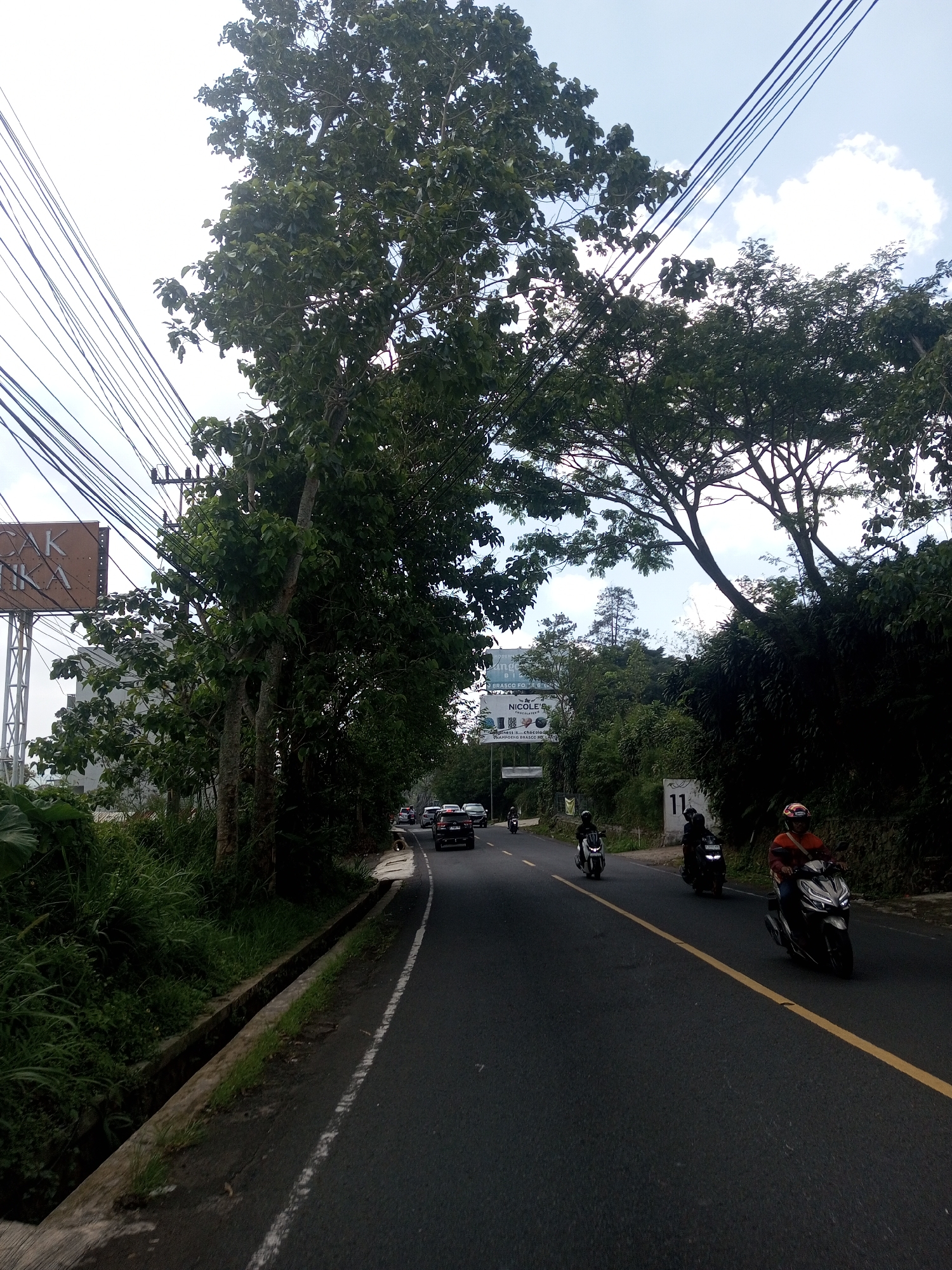 The image depicts a road with a yellow line dividing lanes and a white line marking the shoulder. Three motorcycles are visible on the road, and cars can be seen further ahead. A billboard is visible in the distance with text on it. Trees and foliage line both sides of the road. Power lines are strung above the road. A roadside drain runs along the left side of the road. The scene appears to be set in a rural or suburban area. Based on the location request, this is in Phonethan, Laos.