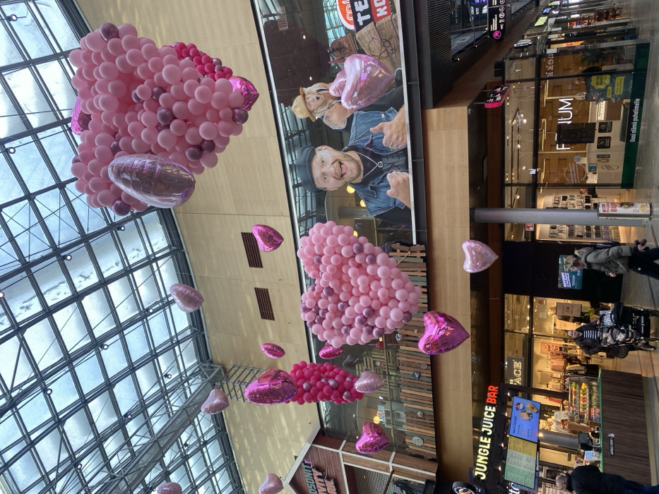 The image depicts the interior atrium of Sello Shopping Centre in Leppävaara, Espoo, Finland. The environment features a high, arched glass roof with a visible metal framework, and multiple levels of retail space. Dominating the upper airspace are numerous heart-shaped balloon decorations. These consist of large clusters of smaller pink and magenta balloons forming distinct heart shapes, alongside individual metallic foil heart balloons of varying shades of pink, suspended throughout the atrium. A large digital banner on an upper-level wall displays a smiling, bearded man wearing a black cap and a denim vest, gesturing with both thumbs up. To the immediate right of this, a partial banner shows a figure in a cowboy hat. On the ground level, identifiable storefronts include "JUNGLE JUICE BAR" on the left, displaying menu boards and a counter, and "PREMIUM," an electronics retailer, on the right. Several individuals are present on the ground floor. A man in a dark jacket is walking left in the lower-left foreground. In the mid-ground, a woman in a striped top pushes a dark stroller, moving towards the left. Another person in a light jacket and dark pants walks towards the right. One individual is visible inside the "PREMIUM" store. The scene is well-lit by natural light filtering through the glass roof and artificial store lighting.