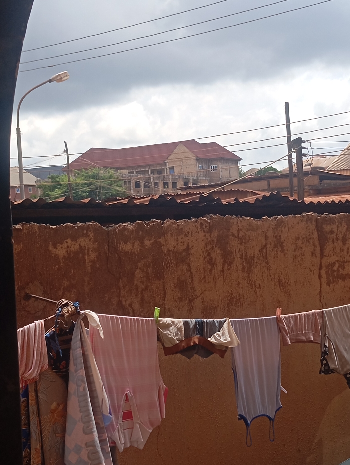 This image depicts a residential scene in Enugu, Nigeria. In the foreground, a clothesline is strung horizontally across a textured, ochre-colored wall, approximately 2 meters in height. Multiple items of clothing, including light-colored tops, dark undergarments, and a patterned towel, are hanging on the line, secured by various colored clothespins. Direct sunlight illuminates the clothes and wall, casting shadows. Above the wall, a line of rusted, corrugated metal roofs is visible, indicative of smaller structures. To the left, a grey street light mounted on a curved pole extends upwards. Several utility poles and a network of overhead power lines traverse the midground. The background is dominated by a large, multi-story building with a distinctive red hipped roof. This structure appears to be under construction or partially completed, featuring exposed concrete or unfinished facades and multiple window openings. Green foliage is visible around the base of this building. In the far distance, additional residential buildings with lighter roofs are faintly discernible. The sky above is heavily overcast with dark grey clouds. No individuals are visible in the scene.