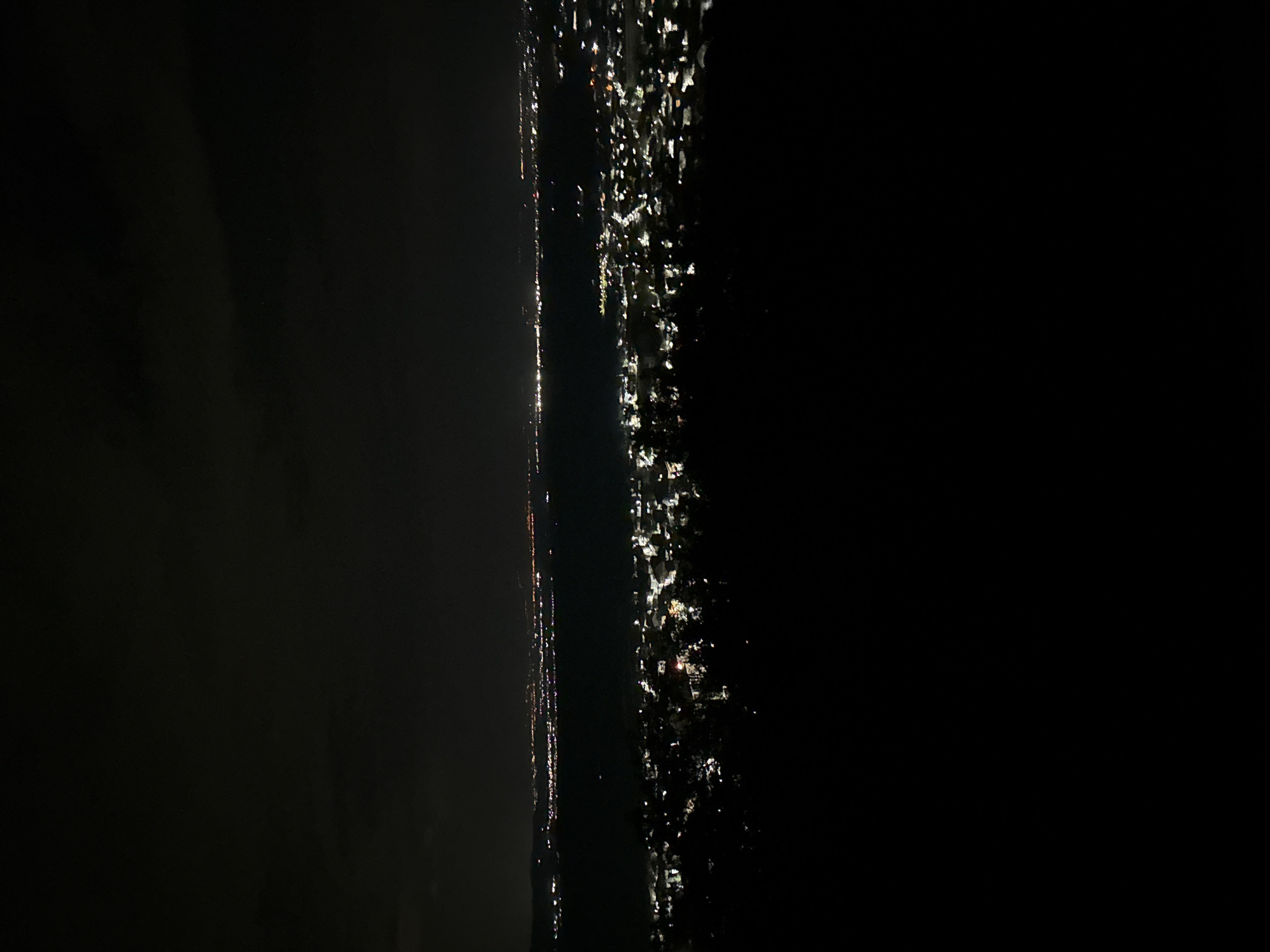nighttime scene. On the left, there's a dark, indistinct area, possibly cloud cover or darkness. Toward the right is a brighter, narrow strip illuminated by scattered light sources, appearing like city lights at night. The scene seems to be taken from an elevated viewpoint, potentially overlooking a body of water or a dark expanse. The scattered lights could be the reflection of the cityscape. Given the context of Perushtitsa, Bulgaria, these lights could be the town reflected in a body of water at night or the town viewed from a high vantage point.