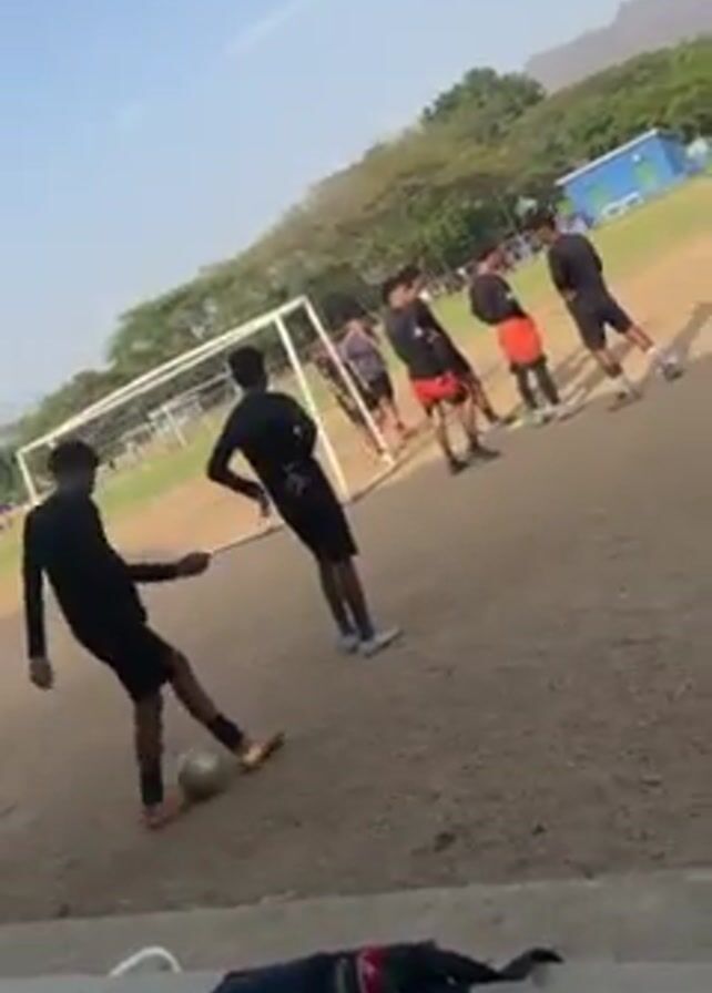 group of soccer players training on a dirt field. There are at least 10 players visible, some wearing black practice gear, one in a red tank top, and another in a Barcelona jersey. Orange cones are spaced out on the field, which suggests a drill is in progress. Some players are jogging around the cones. A stadium is visible in the background with what appears to be spectators sitting in the stands. The background also shows mountains and some trees. The video appears to be taken from an elevated angle, possibly from the stands of the stadium. The weather appears clear and sunny. The players gather in a huddle in the center of the frame.