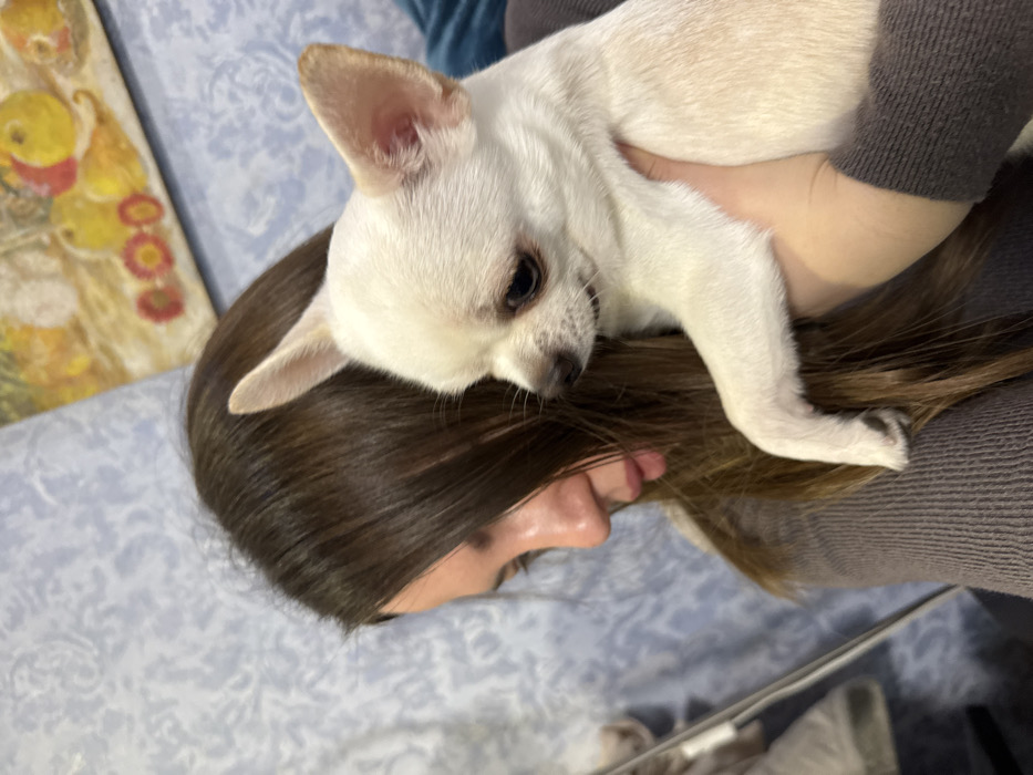 This image depicts an indoor scene occurring in the city of Stary Oskol, Russia. A female individual, with long dark brown hair, is positioned in the left and central portion of the frame. She wears a dark grey ribbed long-sleeved garment. Her left profile, from the nose downwards, is visible as she looks towards the lower left. She is holding a small, cream-colored short-haired chihuahua dog in her left arm. The dog has prominent erect ears with slightly darker tips, dark eyes, and a dark snout, and is facing slightly to the right, away from the female's face. Its front right paw is visible. The background features light blue wallpaper with a subtle pattern. In the upper right quadrant, a framed picture or painting, depicting fruits (e.g., apples) in warm yellow and red tones, is visible on the wall. A blurry, light-colored object, possibly a screen, is partially visible on the far left. A dark teal fabric is discernible on the far right.