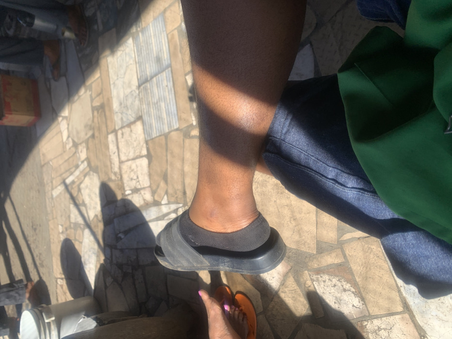The image depicts a ground-level view within an outdoor or semi-outdoor setting in Jos, Nigeria, featuring a patterned tiled floor composed of irregular beige, grey, and white flagstones. Strong sunlight casts distinct shadows across the scene. In the foreground, the lower right leg of a person with dark skin is prominent, clad in dark blue jeans. This individual wears a black slide sandal over a black no-show sock, and a green fabric garment rests on their lap. To the immediate left, a lighter-skinned foot with pink-painted toenails, wearing an orange flip-flop, is partially visible. In the midground, a white plastic bucket or container is situated on the left. On the right, a red cardboard box rests on the tiled surface. Further into the background, the lower legs and feet of at least two additional individuals are discernible; one wears dark pants and brown sandals. The scene suggests a casual public or commercial waiting area.