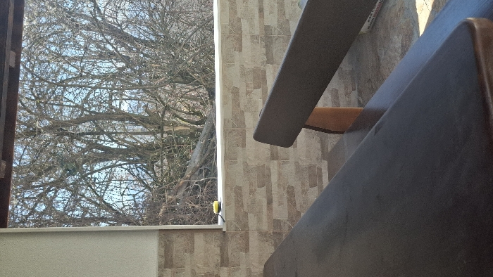 The scene is observed from an interior or semi-enclosed space in Kribul, Bulgaria. In the immediate foreground, a dark brown wooden tabletop extends from the lower left towards the center. To the right, the upper backrest of a matching dark brown wooden chair or bench is partially visible. Behind these items, a wall section is tiled with light brown and beige rectangular tiles arranged in a staggered pattern. Above this tiled wall, a white horizontal ledge serves as the base of an opening, framing an outdoor view. Centered on this ledge is a yellow and black measuring tape, with its metallic hook visible. Beyond the opening, numerous bare deciduous trees with interwoven branches dominate the background against a clear blue sky. A significant fallen tree trunk or large bare branch is horizontally positioned within the visible tree line. The outdoor conditions are brightly lit, consistent with daylight during a leafless season. No individuals are present within the frame.