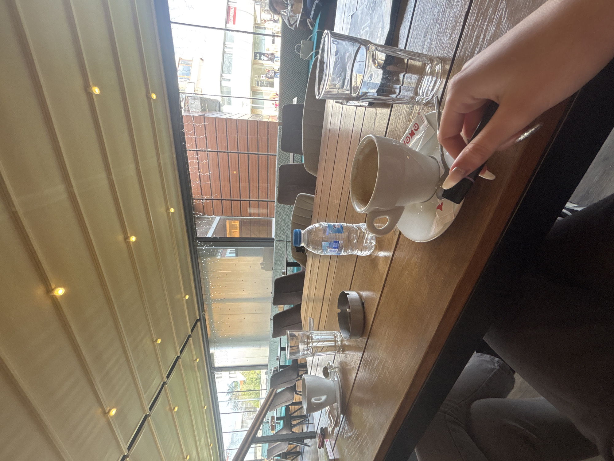 table at an outdoor cafe. On the table, there is a glass of water, an empty coffee cup on a saucer, a sugar packet, a bottle of water, and an ashtray. A person's hand is holding a sugar packet or stir stick near the coffee cup. The table appears to be wooden. Outside, the scene suggests a cityscape with buildings and windows. The cafe has a retractable awning overhead. It is daytime. While the image provides contextual clues about a possible location in Yambol, Bulgaria, there is no definitive way to confirm this specific location without additional information.