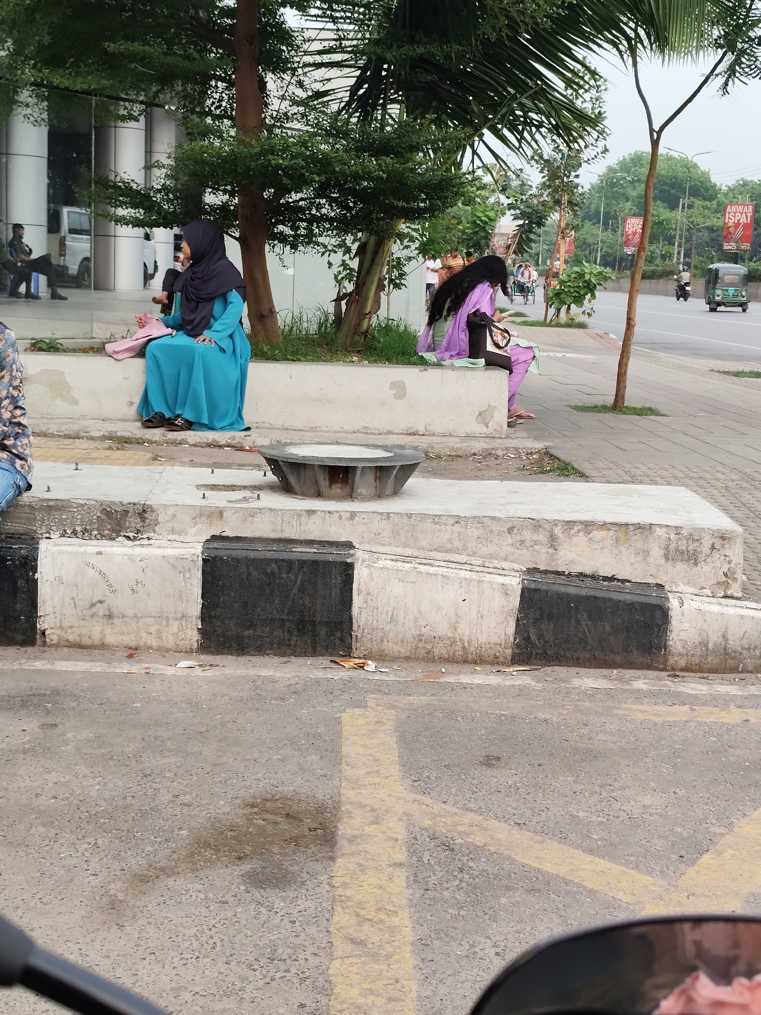 two women sitting on a concrete ledge beside a road in Dhaka, Bangladesh
