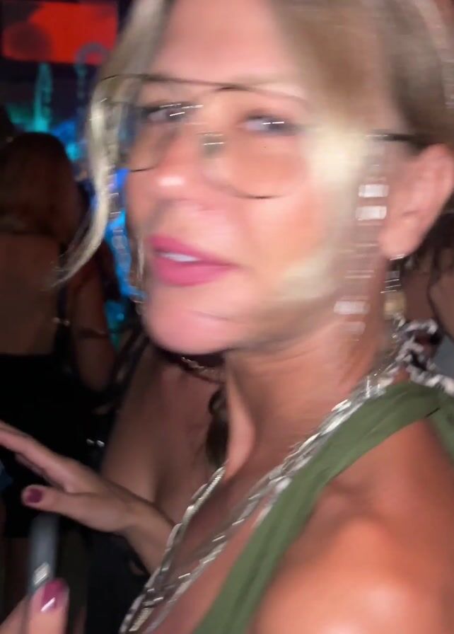 A middle-aged blonde woman wearing glasses is dancing in a club. She is wearing an olive-green top and multiple chains around her neck. A brunette woman is standing to her left. The lights are red and green. The music is loud. The blonde woman sticks out her tongue and winks.