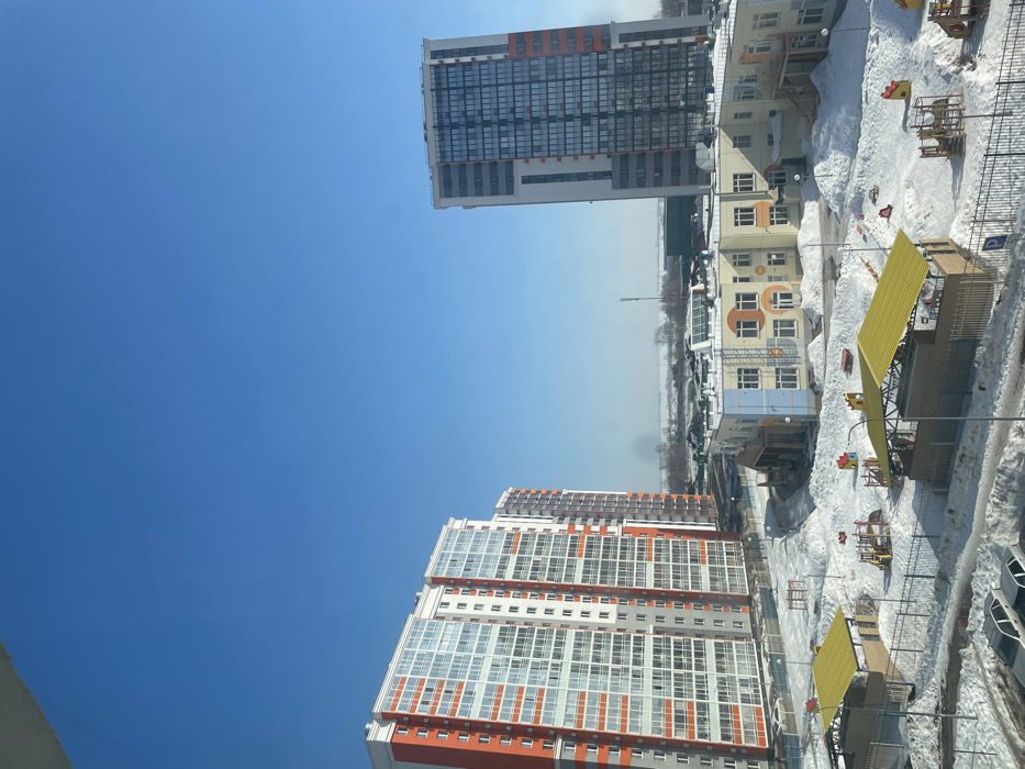 The image presents a detailed view of a winter urban landscape in Naberezhnye Chelny, Russia, captured from an elevated perspective. The scene is dominated by a clear, bright blue sky. In the immediate foreground, a dark metal fence spans the bottom of the frame, partially obscuring parked vehicles on a snow-covered surface. Beyond the fence, a expansive playground area is visible, thoroughly covered in white snow. This area contains several brightly colored children's play structures, including slides and climbing frames, alongside multiple rectangular shelters with distinctive yellow, sloped roofs. No people are present in this area. In the midground, a prominent multi-story residential building with a white, orange, and gray paneled facade and numerous glass balconies stands on the left. To its right, a two-story building, identified as a kindergarten or school, features a light blue, yellow, and beige exterior with multiple windows and access doors, surrounded by snow. Further to the right, another tall residential building with a predominantly gray and dark reflective glass facade is visible. The background consists of a flat, snow-covered landscape stretching to the horizon, indicating open fields or suburban outskirts. A slender, dark tower structure is faintly discernible against the bright sky in the middle-right background. The scene is illuminated by direct sunlight, casting minimal shadows and confirming clear weather conditions. No individuals or active interactions are observed within the depicted area.