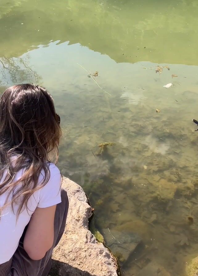 A young woman is crouching on a rock next to a pond looking into the water. The pond water is somewhat murky and green. Several turtles are visible in the water. The woman is wearing sunglasses, a white shirt, and grey pants. The pond is surrounded by green grass and trees.
