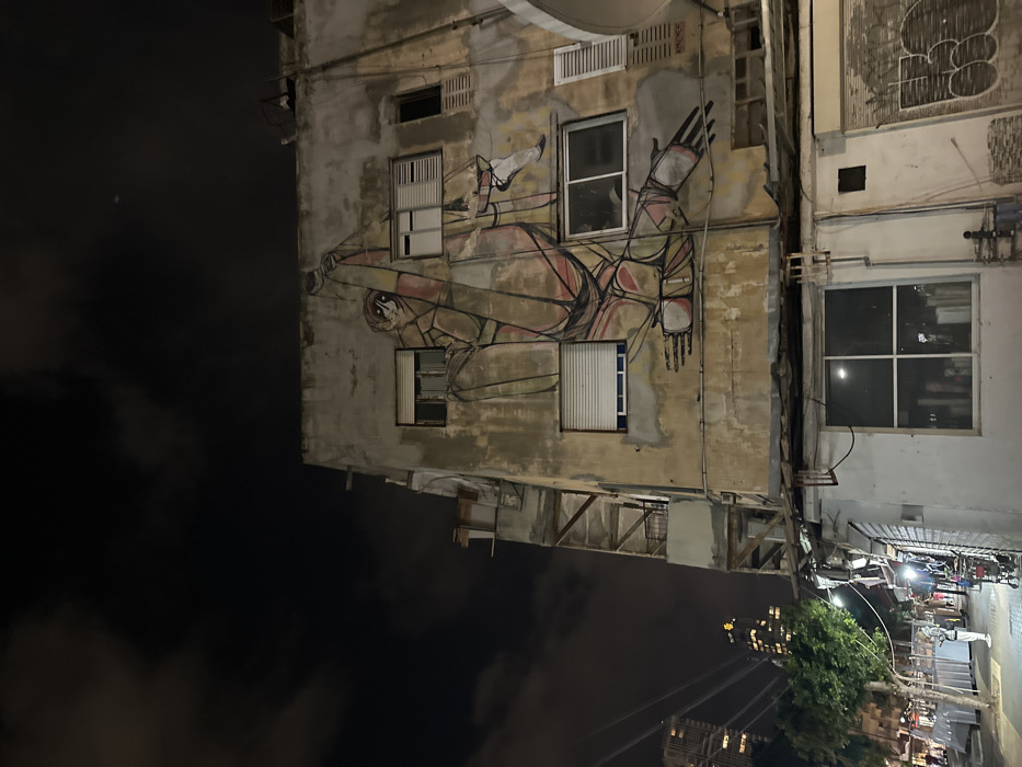 A multi-story building at night features a large mural of a figure painted on its side. The artwork is abstract and uses a muted color palette with red accents, incorporating the windows into the design. The building's facade is weathered. A street scene with lights and trees is visible at the lower right. The bottom of several buildings are visible in the distance.
