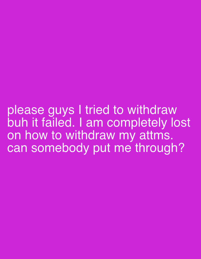 The image displays white text centered on a solid magenta background. The text reads: "please guys I tried to withdraw buh it failed. I am completely lost on how to withdraw my attms. can somebody put me through?" There are no discernible visual elements depicting a physical location, individuals, objects, actions, or specific environmental details, thus the location in the city of Ado, Nigeria, cannot be determined from this image.