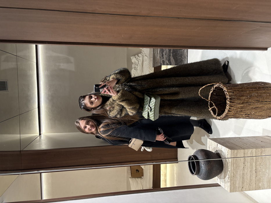 The image displays an interior scene, likely within an upscale retail establishment or a luxury hotel suite in Paris, France. Two Caucasian females are positioned in the foreground, utilizing a large, full-length mirror to take a selfie. The female on the right, actively holding a dark-colored smartphone with both hands, is capturing the mirror reflection. She has long dark hair, dark sunglasses perched on her head, and is wearing a full-length, dark brown faux fur coat over a dark turtleneck. Her lips are pursed, and a quilted green shoulder bag with a gold chain strap is visible on her left side. She wears multiple rings on her fingers. Partially behind her to the left is the second female, also with long dark hair, smiling towards the mirror. She is dressed in a long, dark-colored coat and carries a light beige top-handle handbag on her right arm. She holds a pair of dark sunglasses in her left hand. Both individuals wear dark footwear, specifically boots. The reflected environment behind the women consists of a minimalist room with light-colored, textured walls, framed by dark wood paneling. A horizontal light strip is embedded in the wall above a platform bed with white bedding. A dark marble-top surface is visible next to the bed. On the bed, a brown paper shopping bag featuring a heart logo is present. An air vent is visible at the top of the reflected wall. In the immediate foreground, a tall, cylindrical woven brown wicker basket stands on the floor to the right of the center. To the left, a dark, textured ceramic vessel rests on a light beige, rectangular pedestal, likely made of stone.