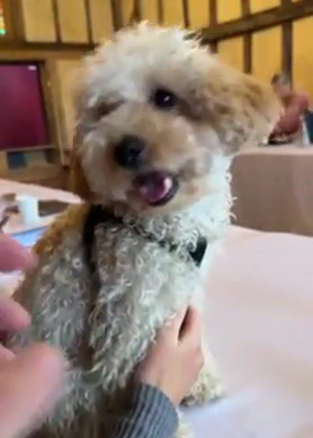 A small dog with curly light brown and white fur sits on a white tablecloth. The dog is wearing a black harness. A person in a gray sweater is holding the dog and petting it. Another person pokes the dog on the face with a finger. The dog briefly sticks its tongue out. In the background, other people are sitting at tables in a room with exposed wooden beams. There is a stained glass window visible in the background.